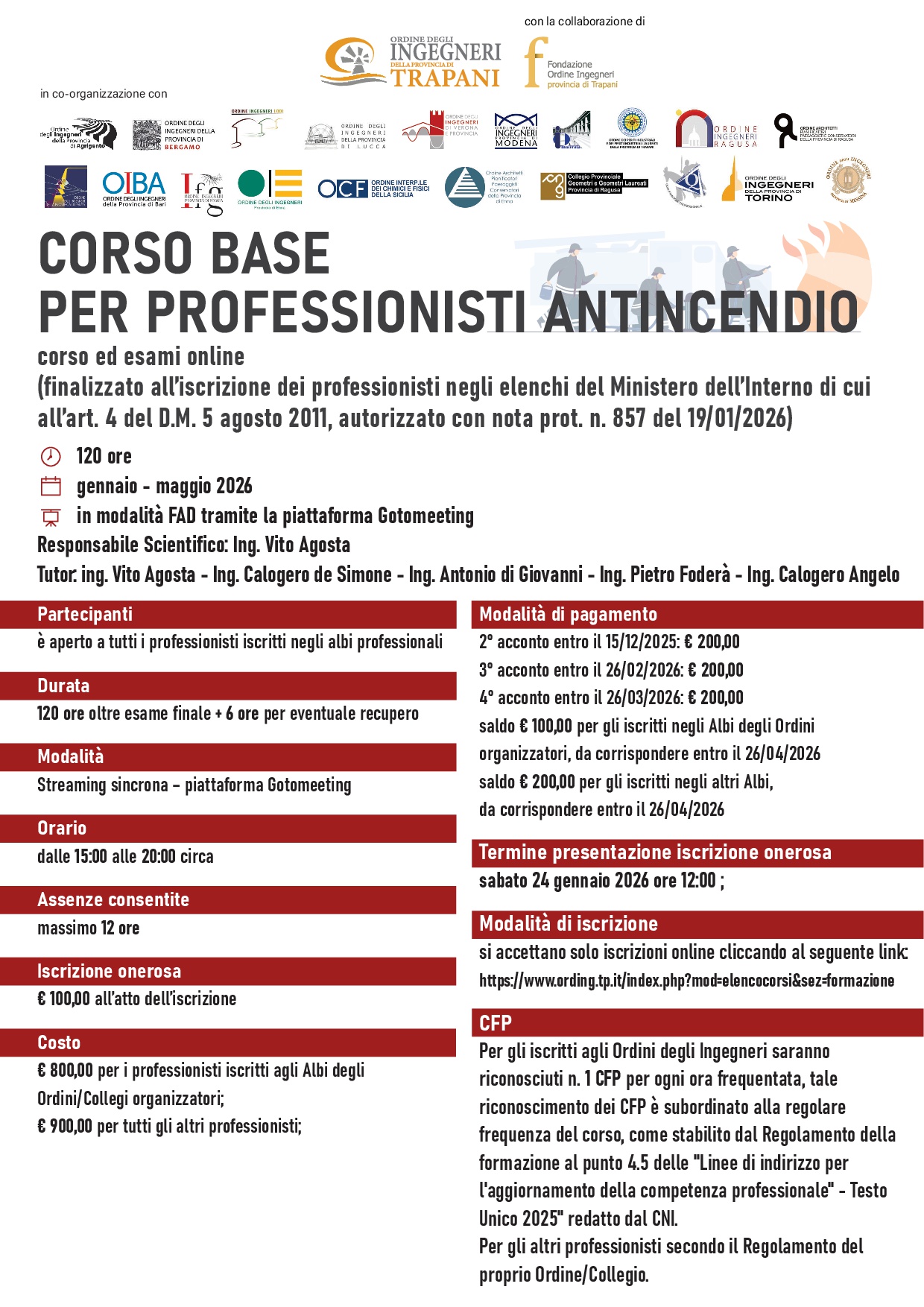 L´Ordine degli Ingegneri della Provincia di Trapani, in collaborazione con la Fondazione Ordine Ingegneri Trapani e la co-organizzazione degli Ordini degli Ingegneri delle province di Agrigento, Bari, Bergamo, Enna, Foggia, Lodi, Lucca, Macerata, Messina, Modena, Parma, Ragusa, Torino, Verona e provincia, gli Ordini degli Architetti P.P.C. delle province di Enna e di Ragusa, il Collegio dei geometri e Geometri Laureati della Provincia di Ragusa, l´Ordine dei Periti Industriali e Periti Industriali della Provincia di Trapani e l'Ordine interprovinciale dei Chimici e Fisici della Sicilia ha in fase di definizione un CORSO BASE PER PROFESSIONISTI ANTINCENDIO (120 ore), valido ai fini dell´iscrizione negli Elenchi del Ministero dell´Interno ai sensi dell´art. 3, comma 2, del D.M. 05/08/2011 e ss.mm.ii., giusta autorizzazione prot.n. 857 del 19/01/2026