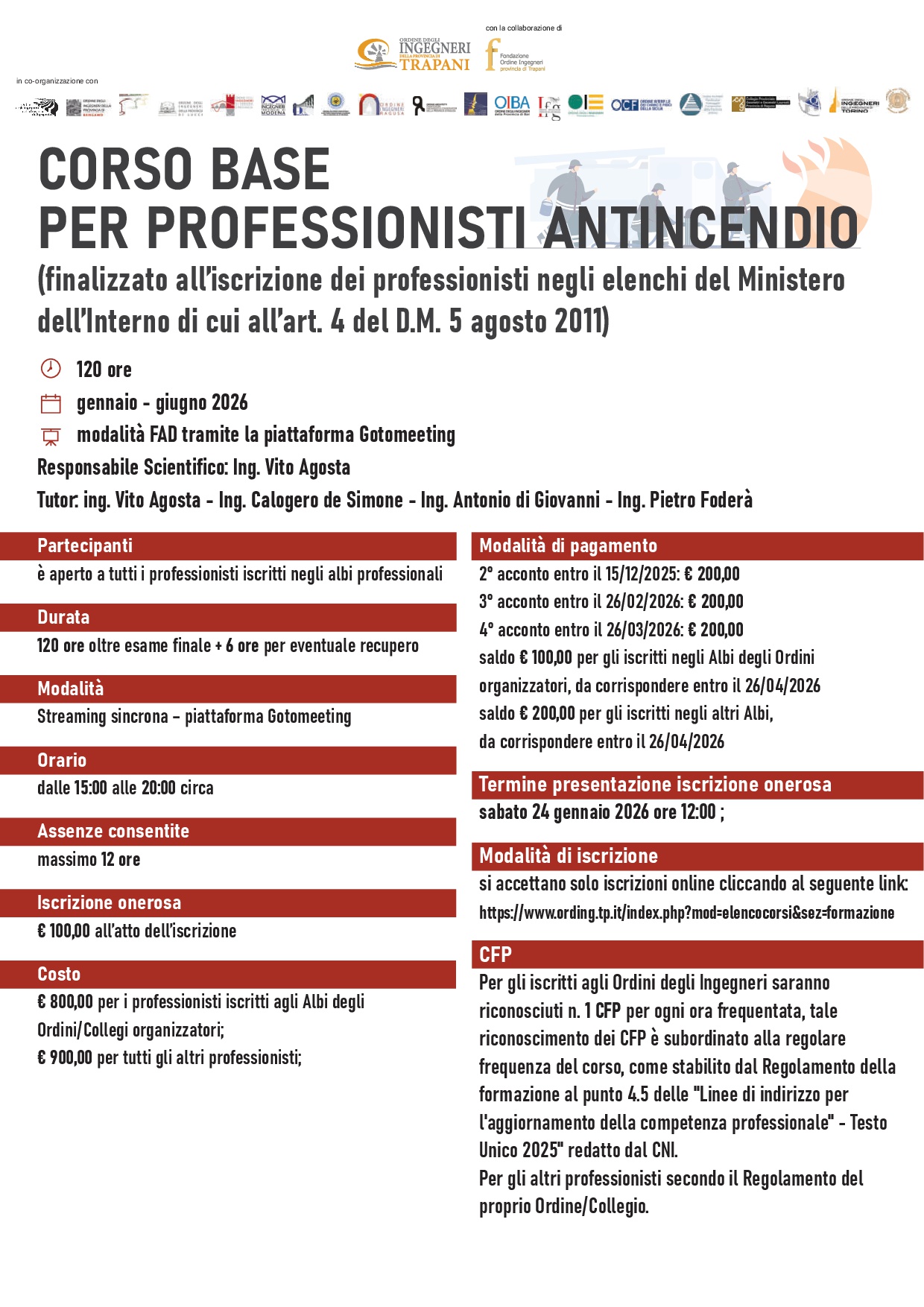 CORSO BASE PER PROFESSIONISTI ANTINCENDIO MODALITA´ ONLINE 120 ORE + 6 ORE DI RECUPERO gennaio 2026 – maggio 2026 L´Ordine degli Ingegneri della Provincia di Trapani, in collaborazione con la Fondazione Ordine Ingegneri Trapani...