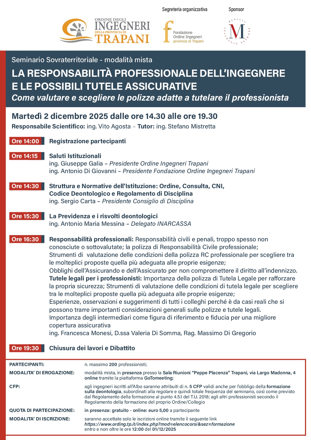 Informazioni generali relative agli eventi: Partecipanti: ingegneri iscritti all´Albo della provincia di Trapani, per un numero massimo di 80 partecipanti; Modalità di partecipazione: presenza - Sala Riunioni “Peppe...