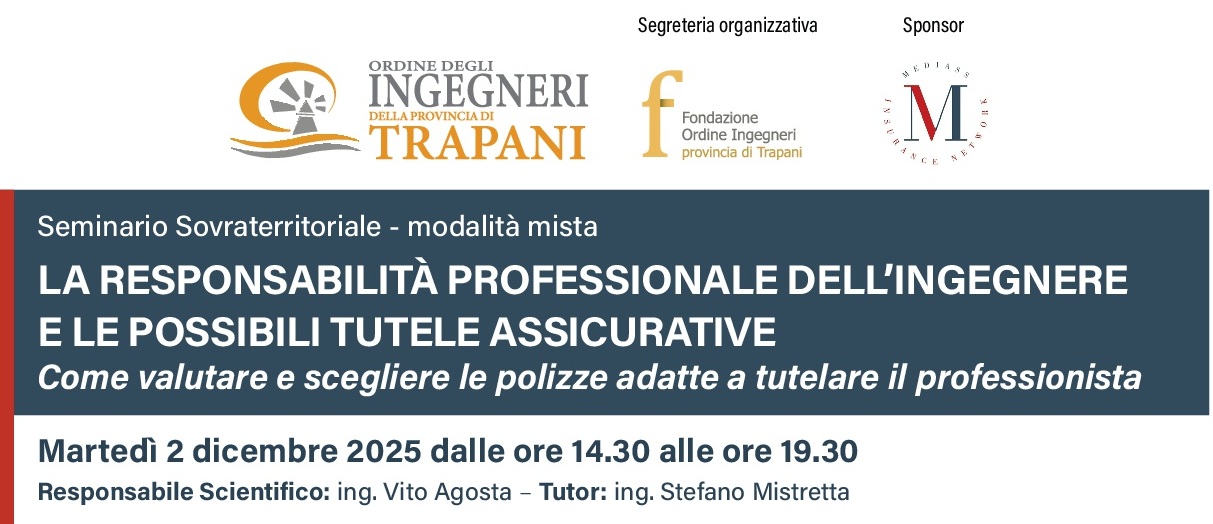 L'Ordine degli Ingegneri della Provincia di Trapani in collaborazione con la F.O.I.T. organizza martedì 02/12/2025, il seminario formativo valido anche per la deontologia professionale